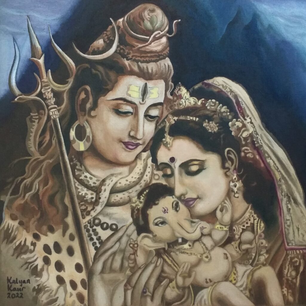 Shiva, Parvati and Ganesha, 2022 (Original oil painting 40cm x 40cm and same size square prints available)